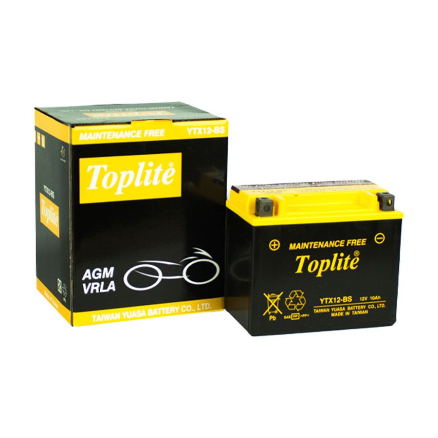 - Ắc quy xe số, xe tay ga (Scooters battery), xe tay côn, ắc quy moto AGM Toplite YTX12-BS 12V 10AH lắp đặt sử dụng tốt cho xe Honda, Yamaha, Kawasaki, Suzuki, SYM, Piaggio, Kymco, BMW Motor, GPX, Aprilia, Harley Davidson, KTM, Royal Enfield, Brixton, Peugeot Motor, Triumph, Mv Agusta, Benelli, TVS,...