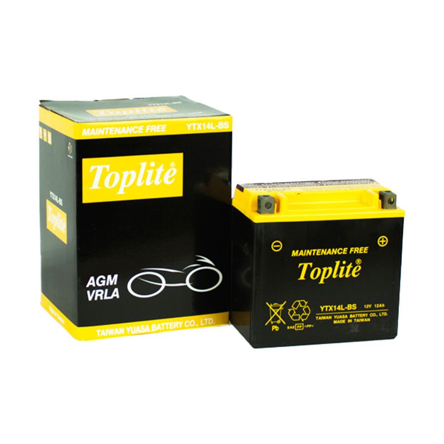 - Ắc quy xe số, xe tay ga (Scooters battery), xe tay côn, ắc quy moto AGM Toplite YTX14L-BS 12V 12.6AH lắp đặt sử dụng tốt cho xe Honda, Yamaha, Kawasaki, Suzuki, SYM, Piaggio, Kymco, BMW Motor, GPX, Aprilia, Harley Davidson, KTM, Royal Enfield, Brixton, Peugeot Motor, Triumph, Mv Agusta, Benelli, TVS,...
